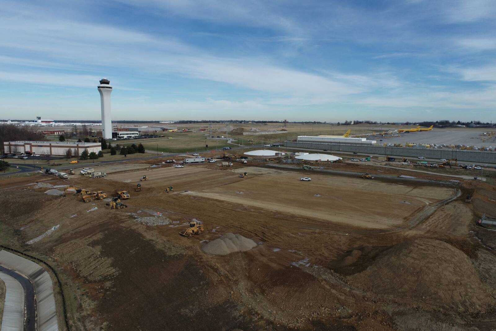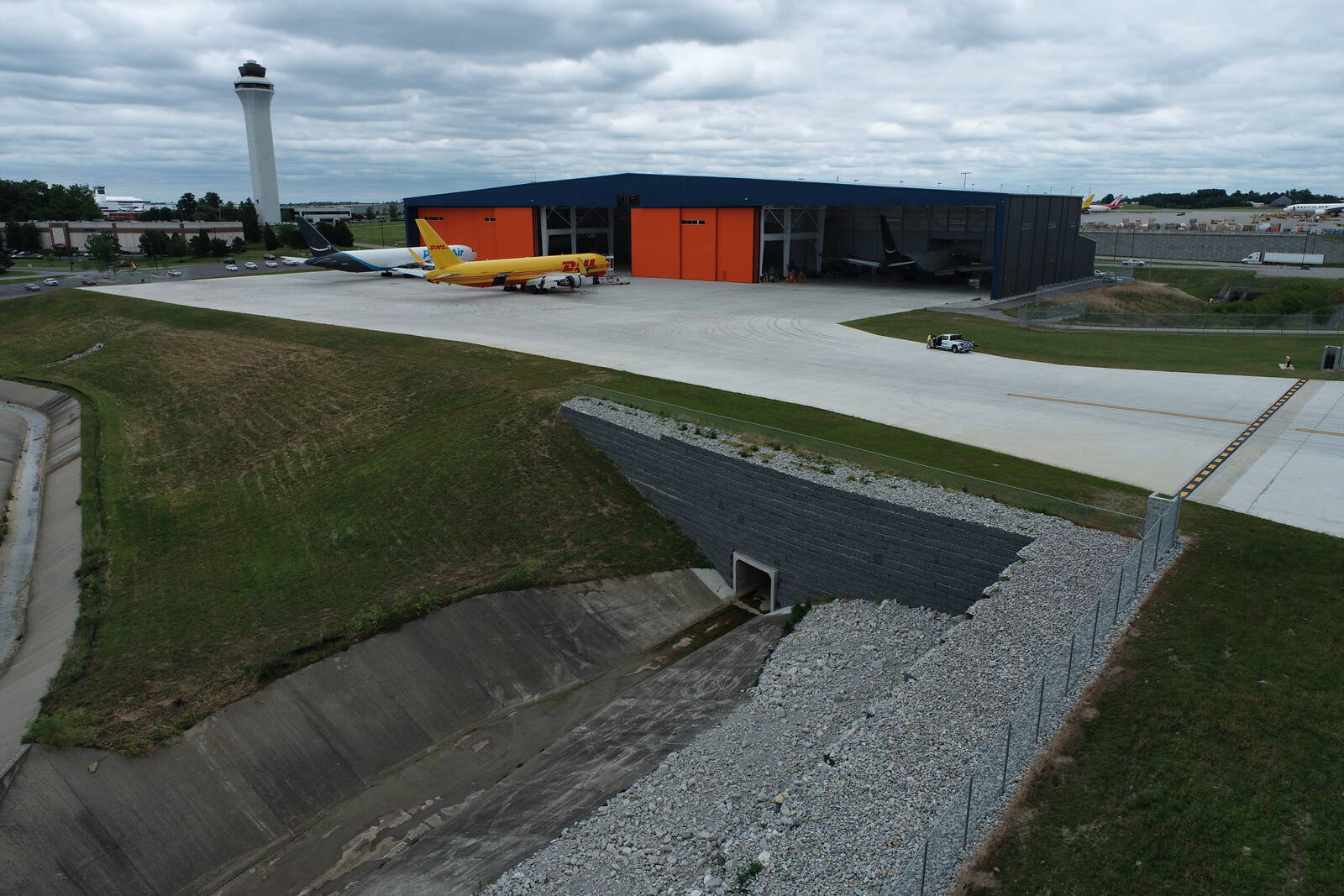 This project is a new $45 million CVG FEAM Aero Hangar at Cincinnati/Northern Kentucky International Airport (CVG). The 150,000 square-foot facility includes three bays designed to house two Boeing 767 & one 777 aircraft simultaneously requiring compliance with all aviation-grade construction standards. Our work here included an import of 75,000cy of structural fill, 30,000cy of onsite cut and fill, 260lf of 12’x10′ precast box culvert, and 7,000lf of storm, sanitary, water & fused pipe glycol utility lines.