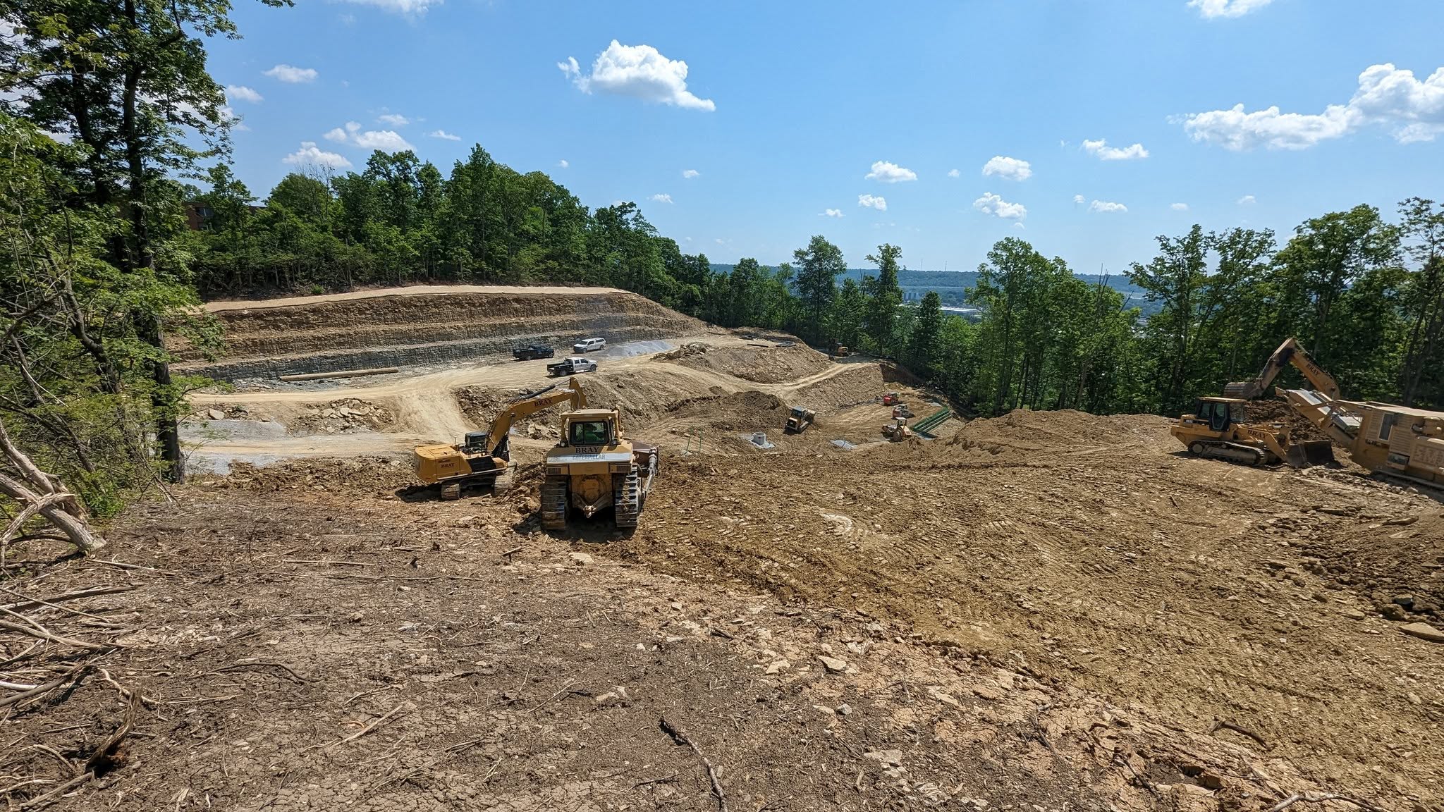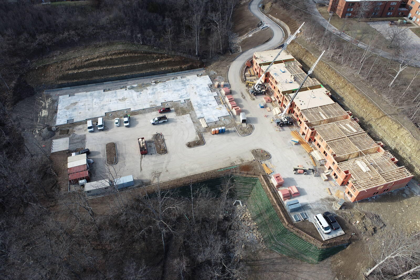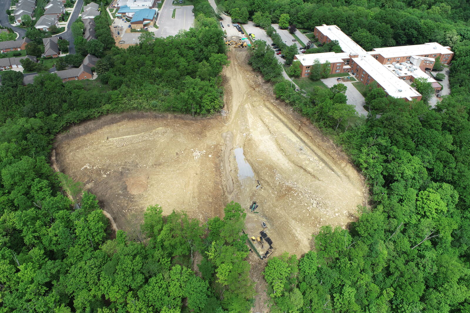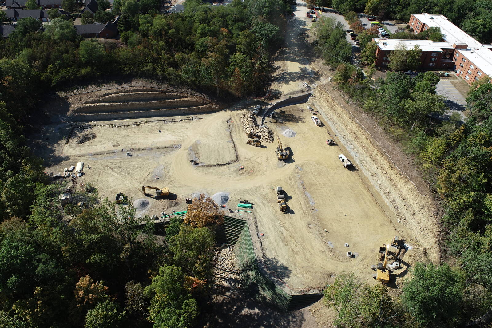 In partnership with Equal Development and the Kentucky Housing Authority, we teamed up to turn a difficult to develop wooded hillside into multiple building pads and parking lots to allow for the construction of much needed affordable housing in Northern Kentucky. Our work included rock excavation, crushing and mixing of interbedded limestone and shale to create structural fill, a 30′ tall Sierrascape retaining wall, thousands of feet of underground utilities, a Conspan Arch open bottom culvert, and creatively working with the project engineer on routing the storm and sanitary sewers down a 250′ elevation change from the site high up on the hillside to the existing mains located in the valley on KY17.